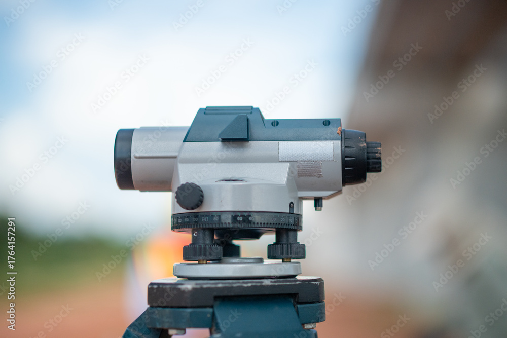 Close-up of a surveyor level instrument (automatic level or theodolite) set on a tripod at a construction site. The equipment is used for land surveying, leveling, and civil engineering measurement.
