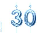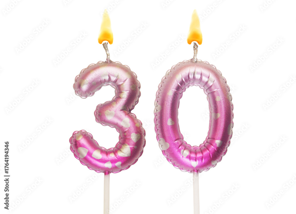 Burning air balloon shaped birthday candles with hearts isolated on white background, number 30