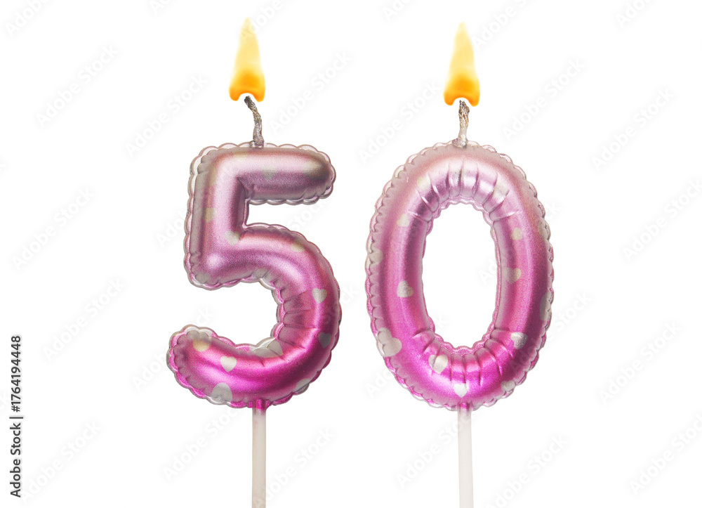 Burning air balloon shaped birthday candles with hearts isolated on white background, number 50