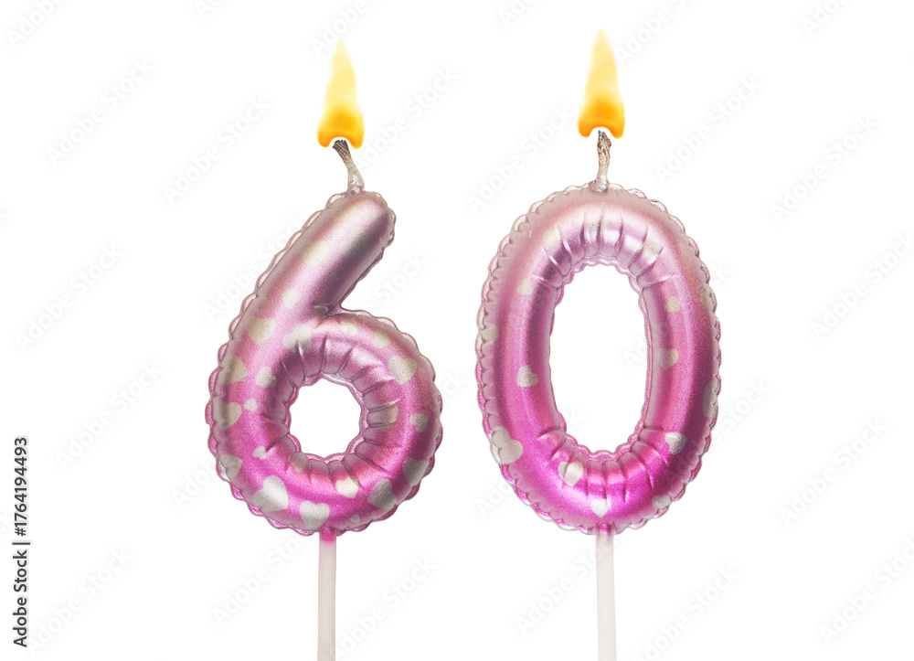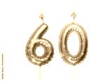 Burning air balloon shaped birthday candles with hearts isolated on white background, number 60
