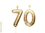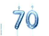 Burning air balloon shaped birthday candles with hearts isolated on white background, number 70