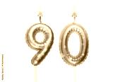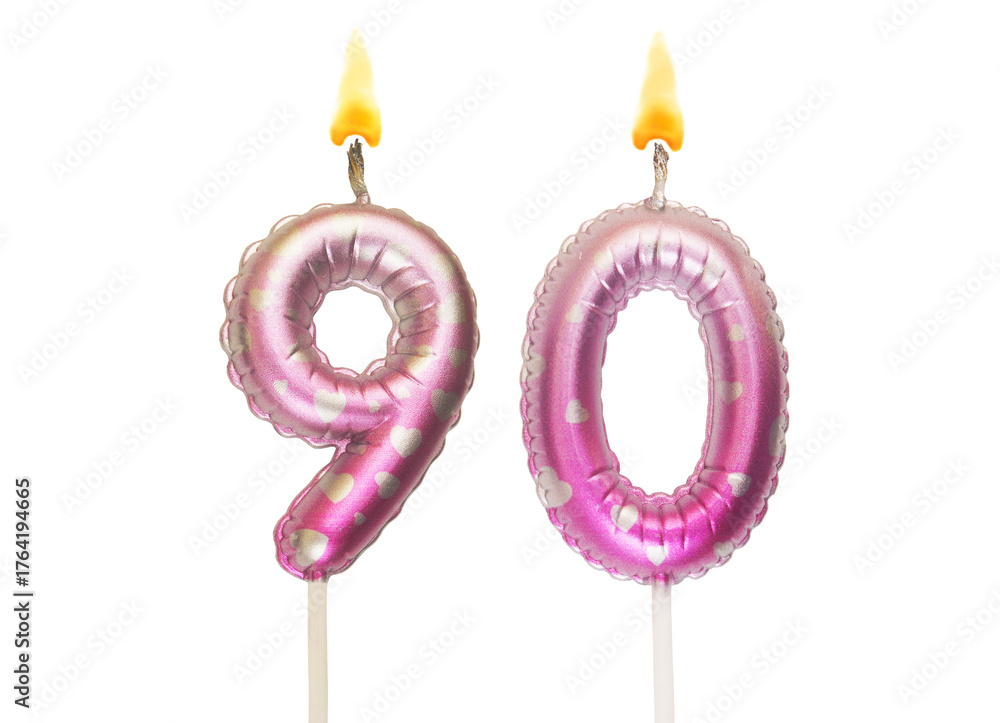 Burning air balloon shaped birthday candles with hearts isolated on white background, number 90