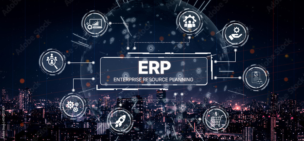 ERP platform visual showing centralized system for enterprise resource planning, improving integration, data flow, business efficiency, finance, inventory, and human resources. Spline