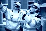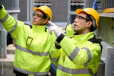 Engineers talk on a walkie talkie and inspecting machinery, wearing hard hats and safety gear in the factory