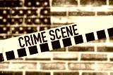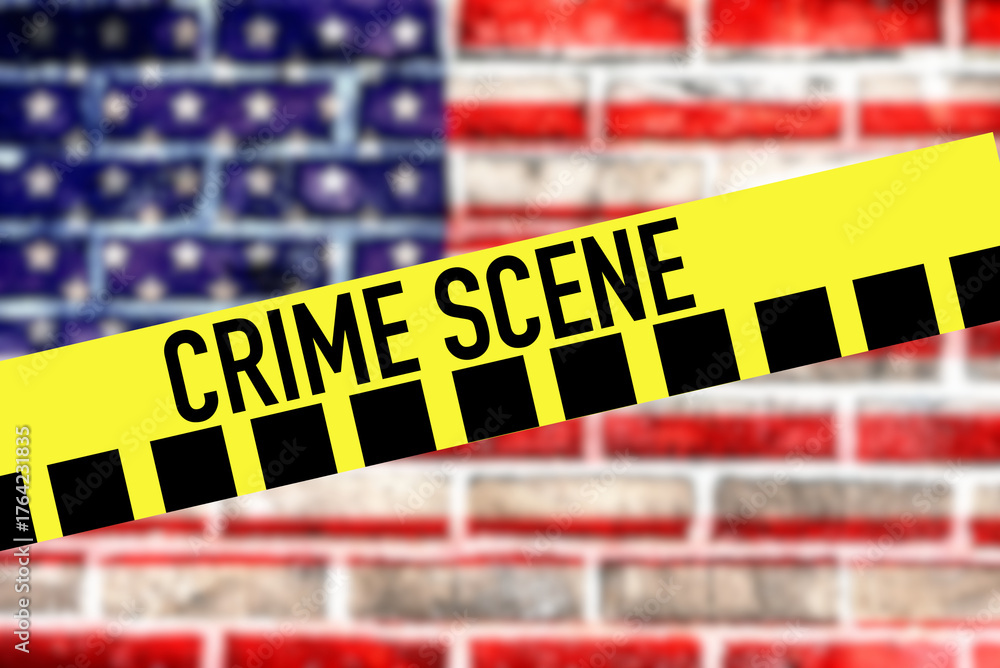 Crime scene tape and American flag in the background as a symbol of crime in the United States