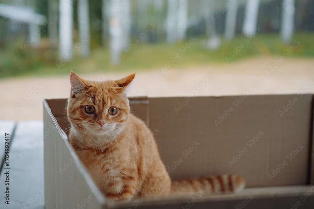 Adorable ginger tabby cat sitting in carton box on terrase of country house