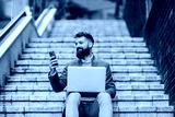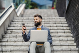 Portrait of businessman sitting on staircase with laptop at financial district and smiling at mobile phone while reading messages.