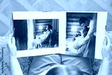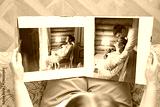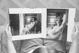 woman is holding and flipping through a photo book with a pregnancy photo shoot