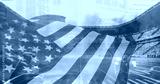 Stretching mother-son duo in sportswear holding ends on field at stadium, with large American flag