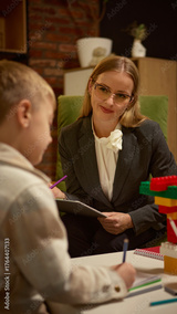 Psychologist smiling at boy drawing with colored pencils during therapy with toy blocks. Concept of empathy, educational psychology, creative learning for healthcare, and child emotional growth.