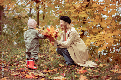 Happy young mother and child are walking in the autumn forest. Autumn outdoor activity with kids. Happy mother's day and family leisure