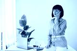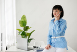 Excited successful employee businesswoman talking on smartphone say yes doing winner gesture, clench fist, sit at office desk with laptop. Achievement career, making a deal, business success concept