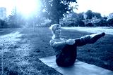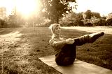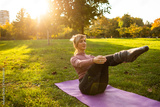 Adult woman practicing yoga in park in autumn. Healthy lifestyle. Navasana, Boat pose.