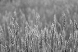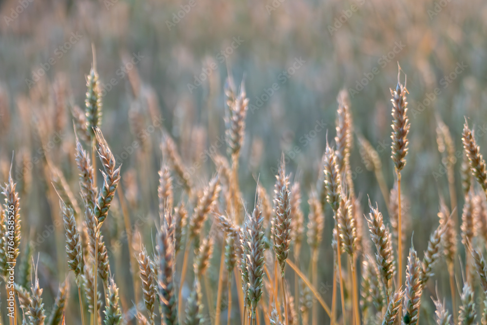 Wheat spikes close-up in morning agriculture field with blurry background