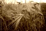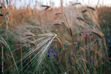 Barley or wild grass ears in morning light with fine spiky awns on blurry background
