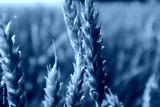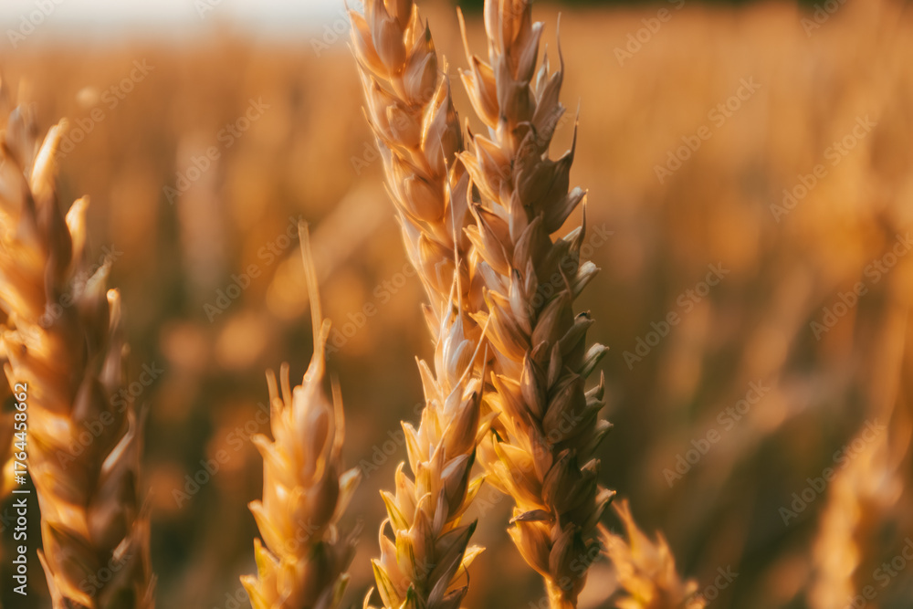 Close-up of ripe wheat ear glowing in warm morning light with soft, blurred background of rural wheat field
