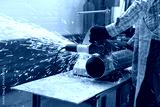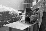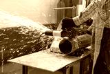 A man cutting a pipe on a special manual machine. The concept of hard work and dedication to the task at hand