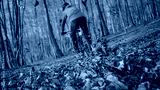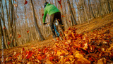 CLOSE UP, LOW ANGLE VIEW, DOF: Mountain biker in a green jacket rides fast through a sunlit autumn forest in golden sunset light. Dry, fallen leaves fly through the air as he brakes while descend.