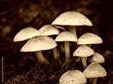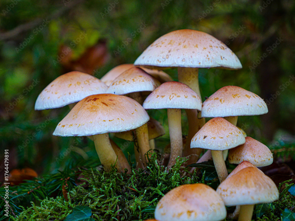 CLOSE UP, MACRO: Group of wild sulfur tuft mushrooms grows among green moss and ivy in autumn forest. Natural harmony and moist textures of an untouched woodland ecosystem in colourful fall season.