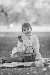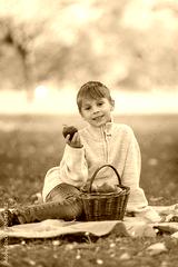 Adorable little child, boy in park on autumn day, beautiful sunny day, basket with apples
