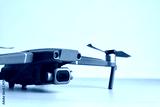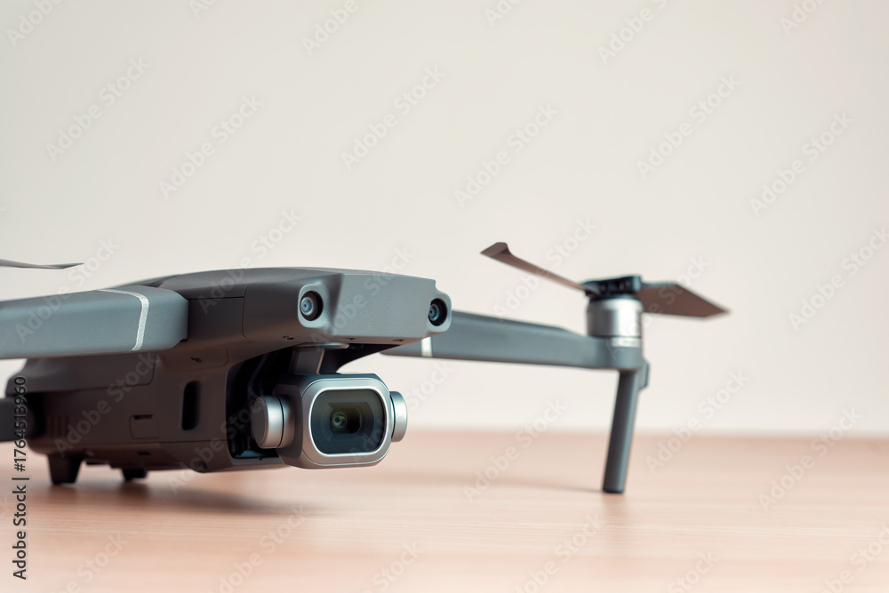 Close-up of a drone on wooden table with some copyspace on the background