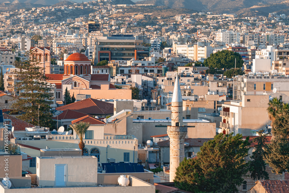 Limassol cityscape showing church and minaret tower at golden hour. Cyprus