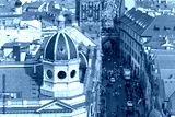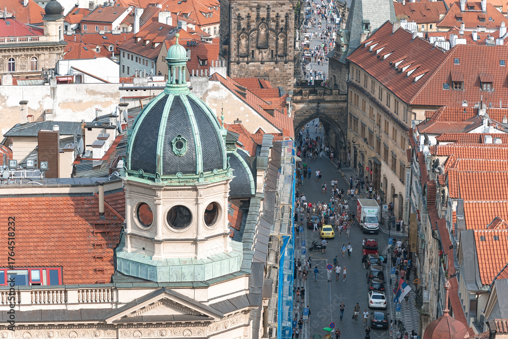 Prague, Czech Republic - September 14, 2019: Mostecka street and Charles bridge as seen from Church of Saint Nicolas