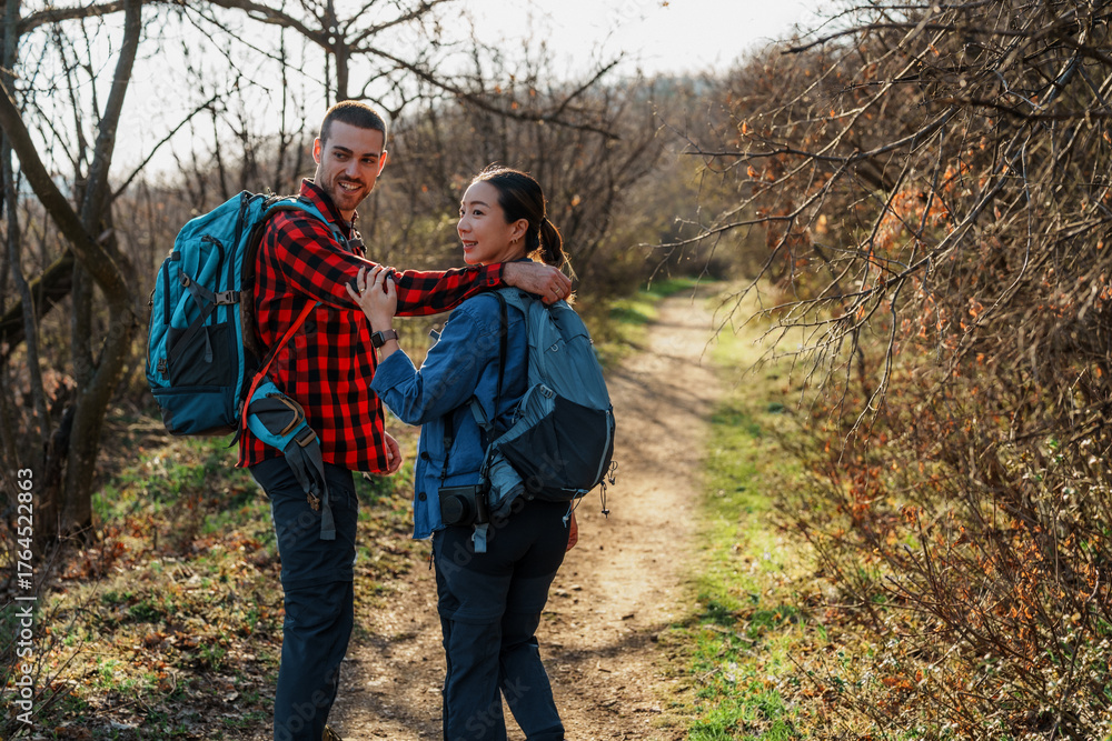 Hikers with backpacks walking along a forest path, embracing each other under the warm sunlight during the day. Surrounded by trees, they enjoy a moment of love and togetherness in nature