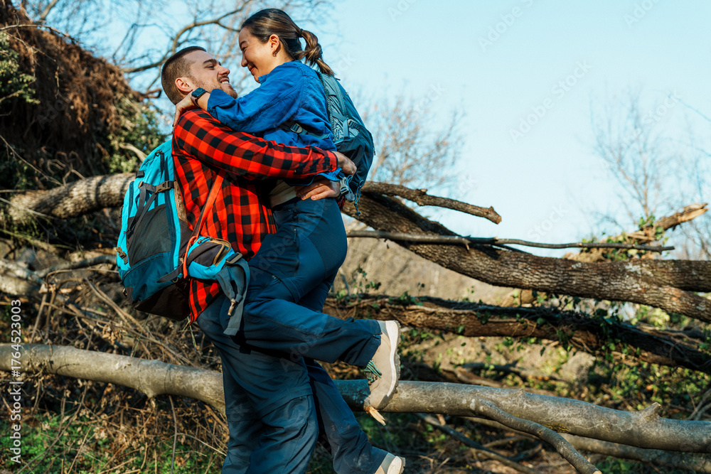 Young hikers couple embracing each other while hiking in wild forest during a sunny day, expressing love and happiness during their outdoor adventure