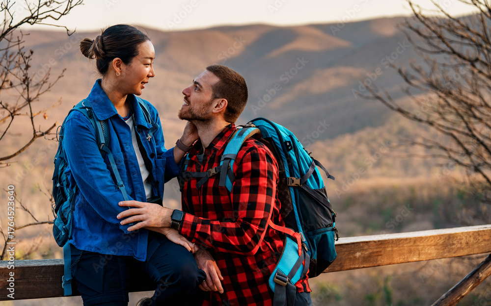 Young couple of hikers wearing backpacks are taking a break on a wooden fence, enjoying a romantic moment while admiring a beautiful mountain view