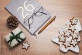 Notebook, pen, glasses, gift box, pine cone on a wooden background. Star-shaped cookies on a plate in the shape of a Christmas tree. Festive background. New Year and Christmas.
