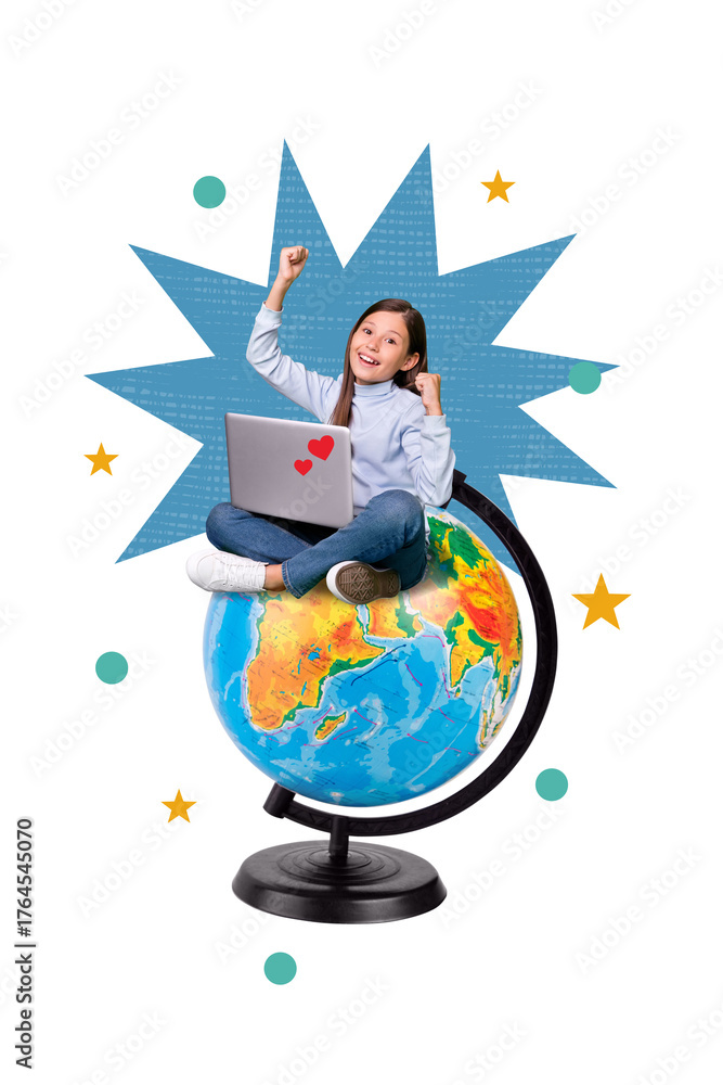 Vertical photo collage of happy schoolgirl sit globe geography lesson elearn hold laptop device education isolated on painted background