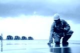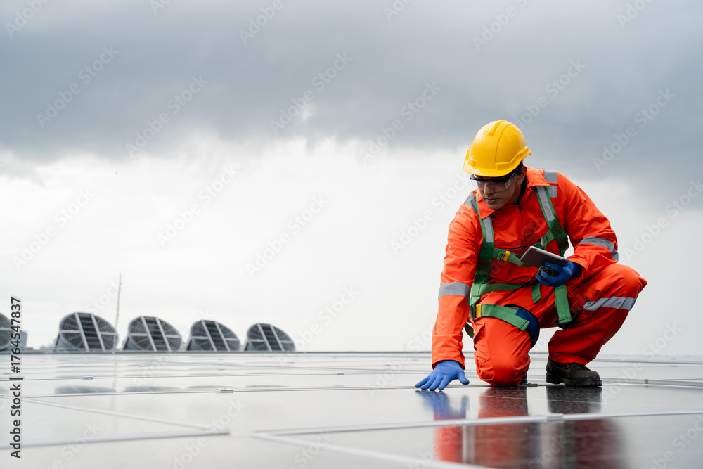 A man in an orange safety suit is kneeling on a roof, looking at a tablet
