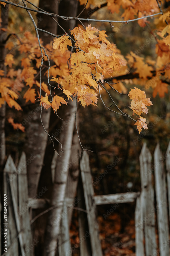 Golden Autumn Maple Leaves with Old Wooden Fence