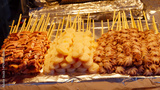 Prepared seafood skewers including squid, scallops, and baby octopus on display