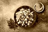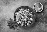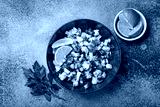 Fresh and vibrant peruvian seafood ceviche with shrimps, octopus, tomatoes, cucumber and parsley, served with lime in a bowl on a stone background from above, dish of Peru