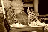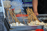 Vendor preparing Korean fish cakes - odeng or eomuk - on skewers for street food