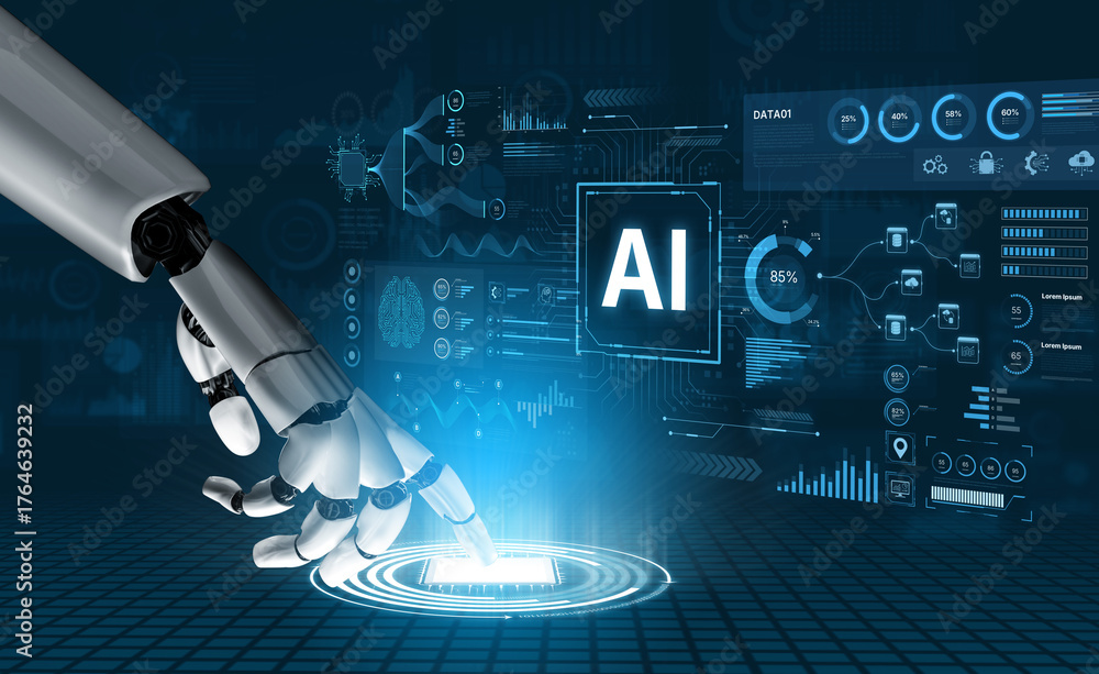 A generative AI assistant displays its business intelligence dashboard. The system processes complex data, providing advanced analytics and visualizations for strategic insights. Fermion