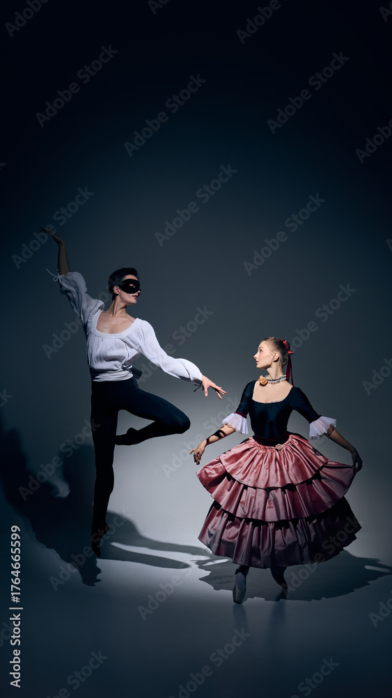 Silent communication. Ballet duet expressing grace and focus through motion. Concept of understanding, harmony, and emotional balance between two performers.