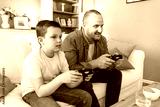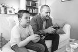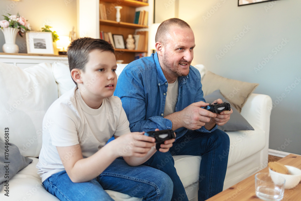 Shot of a young man playing video games with his son at home. Parent spending free time with his son and playing videogames.