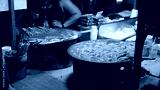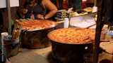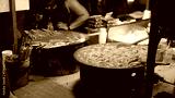 Boiling Korean street food tteokbokki and odeng in large pots at a night market stall
