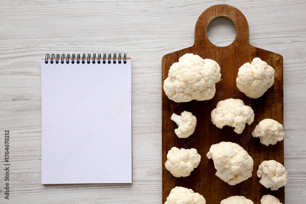 White Organic Raw Cauliflower Florets on a Wooden Board, blank notepad, top view.