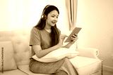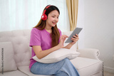A young woman enjoys her leisure time while wearing headphones, using a tablet on a comfortable couch. A scene of tranquility, with the girl relaxed and at ease