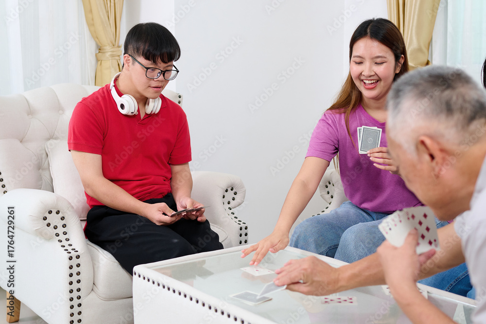 A man with down syndrome and his family plays cards together in a cozy living room, filled with joy and connection. The scene shows the warm bonds of family and the simple pleasure of playing cards
