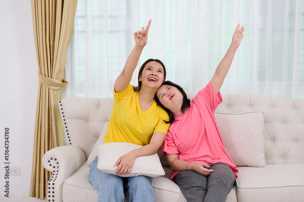 Woman with down syndrome and her friend sitting on a couch, with pointing upward, showcasing a moment of shared joy and wonder
