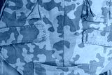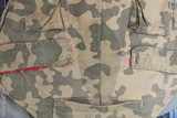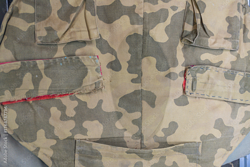 Close-up view of a military-style camouflage jacket with irregular, multi-colored brown, green patterns Jacket features multiple pockets and long sleeves no human figures or texts present