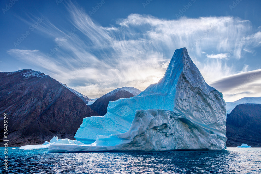 A giant blue iceberg inKjerulf fjord, Northeast Greenland National Park. Known as the Iceberg Graveyard, because they are driven in by wind and currents and become stranded. Early morning light.