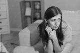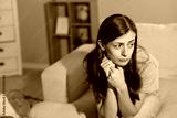 Frustrated woman sitting on sofa at home. Space for text
