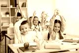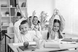 Cute children raising hands at wooden desks during art lesson in elementary school