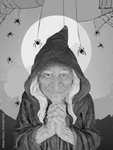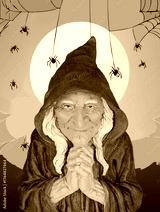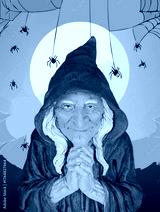 Mystical witch with gray hair and blue eyes in a brown cloak against a spooky orange background with spiders and a full moon